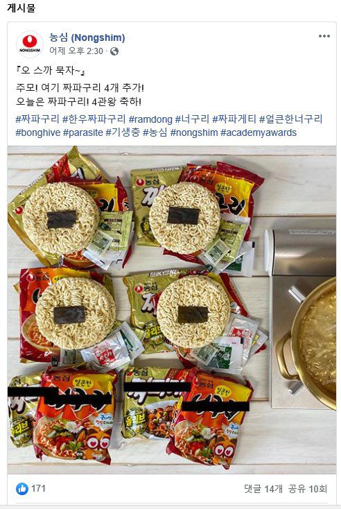 [스타인뉴스 이상백 기자] 영화 기생충의 아카데미 4관왕에 농심이 활짝 웃었다. 영화에 등장한 짜파구리(짜파게티+너구리)가 덩달아 관심을 받았기 때문.