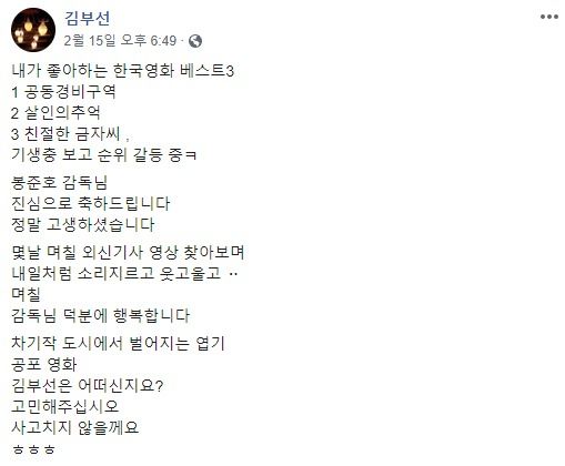 이어 “봉준호 감독님 진심으로 축하드립니다. 정말 고생하셨습니다”라며 “외신, 영상을 찾아보며 내 일처럼 소리 지르고 웃고 울고. 며칠 동안 감독님 덕분에 행복합니다”고 덧붙였다.