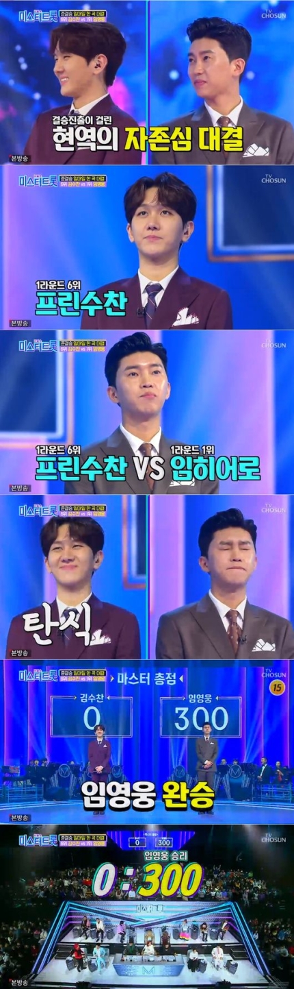 두 사람 모두 심사위원들의 호평을 받은 상황. 하지만 결과는 놀라웠다. 300대 0으로 임영웅이 몰표를 받으며 김수찬과의 대결에서 완승했다. 이로써 임영웅은 준결승전 최종 1위에 등극하는 데 한층 가까워졌다.