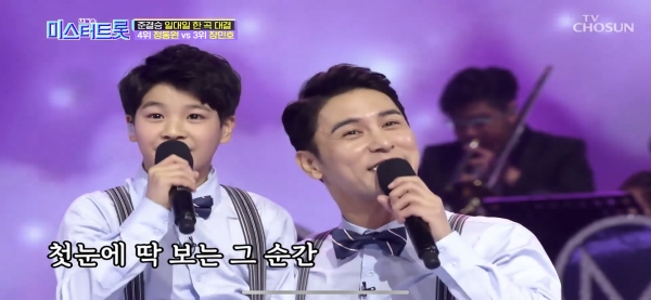 [스타인뉴스 조민정 인턴기자] 미스터트롯 장민호와 정동원이 30살 차이를 뛰어넘는 조카 삼촌 케미를 보여줬다.