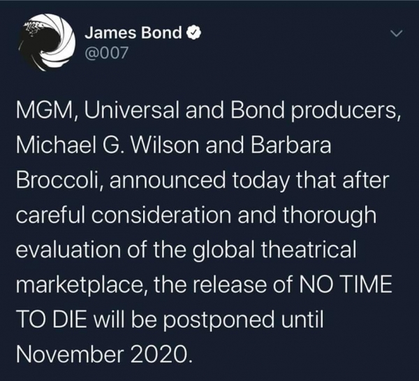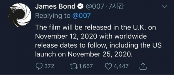 미국 씨넷에 따르면 현지시간 4일 제임스 본드 공식 트위터 계정에 '007 노 타임 투 다이' 개봉을 11월로 미룬다는 공지가 올라왔다. 개봉 연기는 제작사인 MGM과 유니버셜, 제작자인 마이클 윌슨과 바바라 브로콜리가 결정한 것이라고 밝혔다.