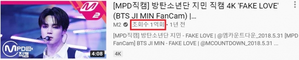 방탄소년단(BTS) 지민, 'Fake Love' 직캠 1억뷰 돌파