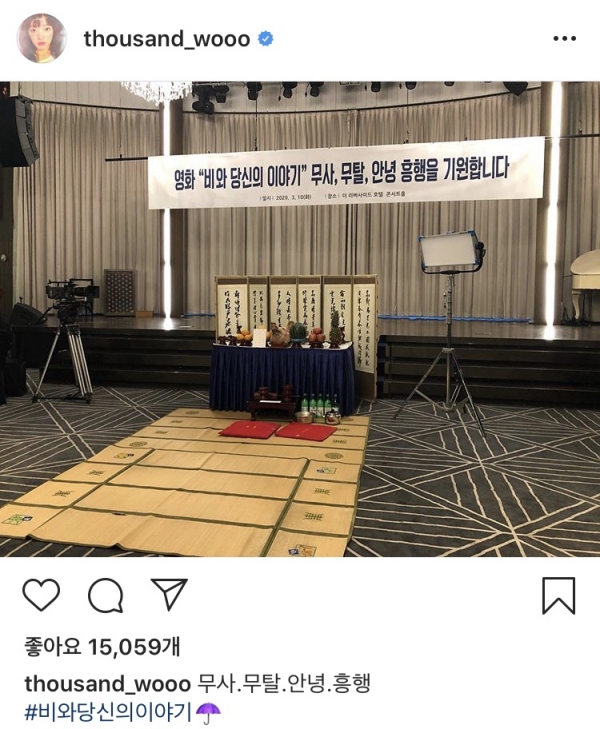 [스타인뉴스 이주빈 인턴기자] 지난 10일, 배우 천우희 인스타그램에 영화 '비와 당신의 이야기' 무사, 무탈, 안녕, 흥행을 기원합니다. 라고 적힌 사진과 무사, 무탈, 안녕, 흥행이라는 멘트와 함께 게시글이 올라왔다. 이로 인해 곧 개봉 예정인 영화 '비와 당신의 이야기'에 사람들의 관심이 쏠리고 있다.