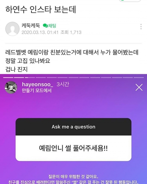 앞서 하연수는 인스타그램 스토리에 무엇이든 물어보세요라는 글을 게시한 바 있으며 이에 한 네티즌이 레드벨벳 예리와 함께 있었던 일화를 풀어달라는 질문에 '질문이 매우 위험한 것 같아요. 친구를 진심으로 배려한다면 말씀해주신 썰같은 걸 푸는 건 잘못된 행동입니다. 이미 아시겠지만 착하고 생각 깊은 동생이에요'라고 대답했다.