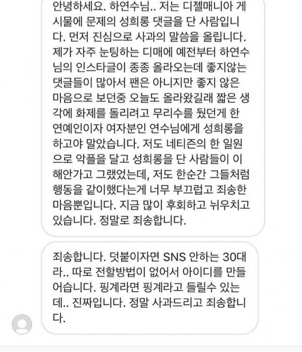 하연수가 악플러들을 고소한다고 나서자 그제서야 여러 악플러들이 하연수에게 사과의 메세지를 전달했다. 이에 하연수는 '제가 특정 카페를 언급하며 악플러를 고소하겠다는 게시물에 보내주신 많은 공감과 응원의 말씀들, 그리고 비판들을 모두 잘 읽고 있다'며 악플러들을 고소하기보다는 그들과 대화를 하고 싶다고 했다. 그래서 그들을 유튜브에 출연시켜 성희롱 근절에 나서주실 마음이 있는 건지 여쭤보고 싶었다고 했다.
