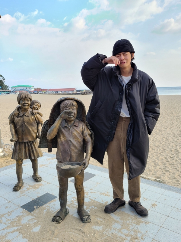 사진 속 그는 '키'를 뒤집어 쓴 채 소금을 받으러 다니며 우는 아이의 동상을 따라하며 귀여움을 자아냈다.