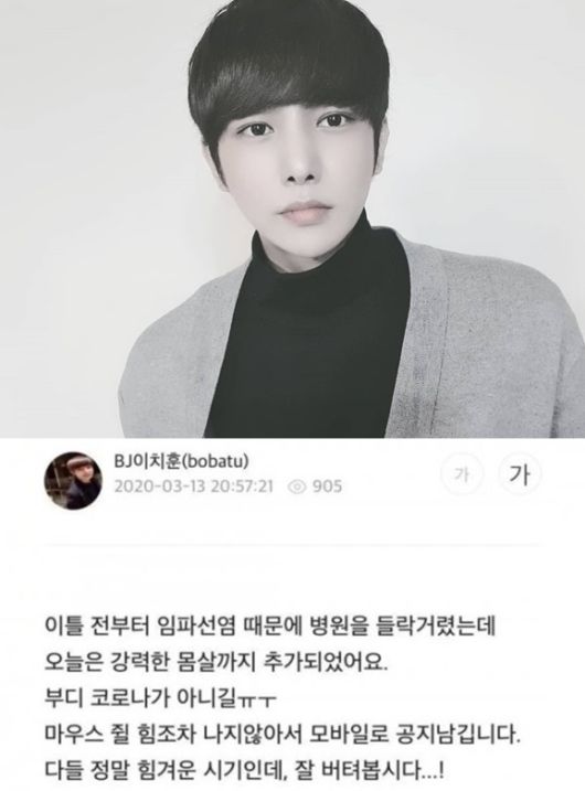 그가 사망 전 올린 글도 주목받았다. 이치훈은 13일 아프리카TV 휴방을 공지하며 “이틀 전부터 이틀 전부터 임파선염 때문에 병원을 들락거렸고 오늘은 강력한 몸살까지 추가됐다. 부디 코로나19가 아니길, 마우스 쥘 힘조차 나질 않는다”고 전했다.