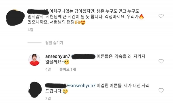 안서현은 5일 전 자신의 인스타 그램에 '코로나19보다 더 속상한 일이 생겨서요', '어른들은 왜 약속을 지키지 않을까요', '이 또한 지나가겠지'라는 말을 남기며 속상한 심정을 토로하기도 했다.
