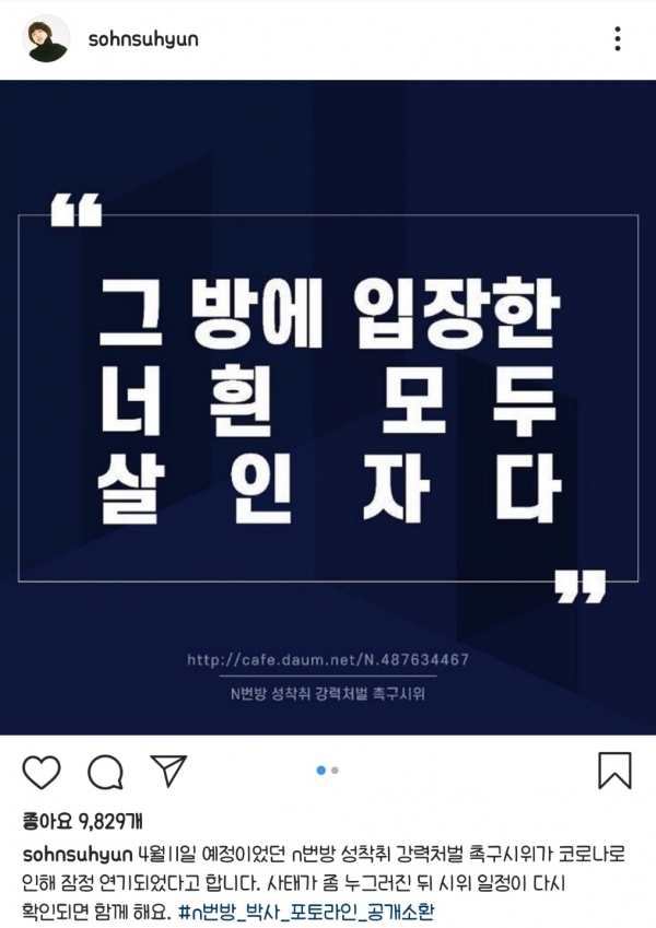 배우 손수현도 인스타그램을 통해 “강력한 처벌을 촉구한다. 이런 비윤리적인 행위의 결말이 징역 몇 년 이딴식이면 진짜 다 뒤집어 엎어버릴 것. 신상공개하고 포토라인 세워라. 2만명 참여자 모두 잡아내고 사회에 발 디딜 수 없게 만들어야 한다. 진짜 심한 말 나온다.”며 강력처벌을 강조했다. 또 강력처벌 촉구시위가 코로나로 인해 잠정 연기됐다는 소식도 전해 직접 사건에 대한 정보를 찾아내는 태도를 보였다.