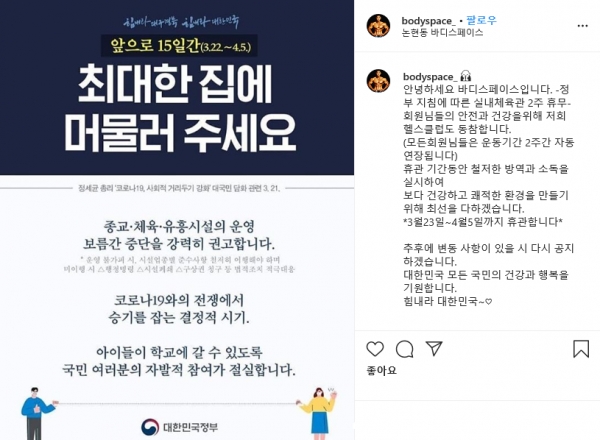 그는 22일 자신의 인스타그램에 "-정부 지침에 따른 실내체육관 2주 휴무- 안녕하세요 바디스페이스입니다. 회원님들의 안전과 건강을위해 저희 헬스클럽도 동참합니다. (모든회원님들은 운동기간 2주간 자동연장됩니다) 휴관 기간동안 철저한 방역과 소독을 실시하여 보다 건강하고 쾌적한 환경을 만들기위해 최선을 다하겠습니다. *3월23일~4월5일까지 휴관합니다*"라며 2주간 중단의 뜻을 밝혔다.