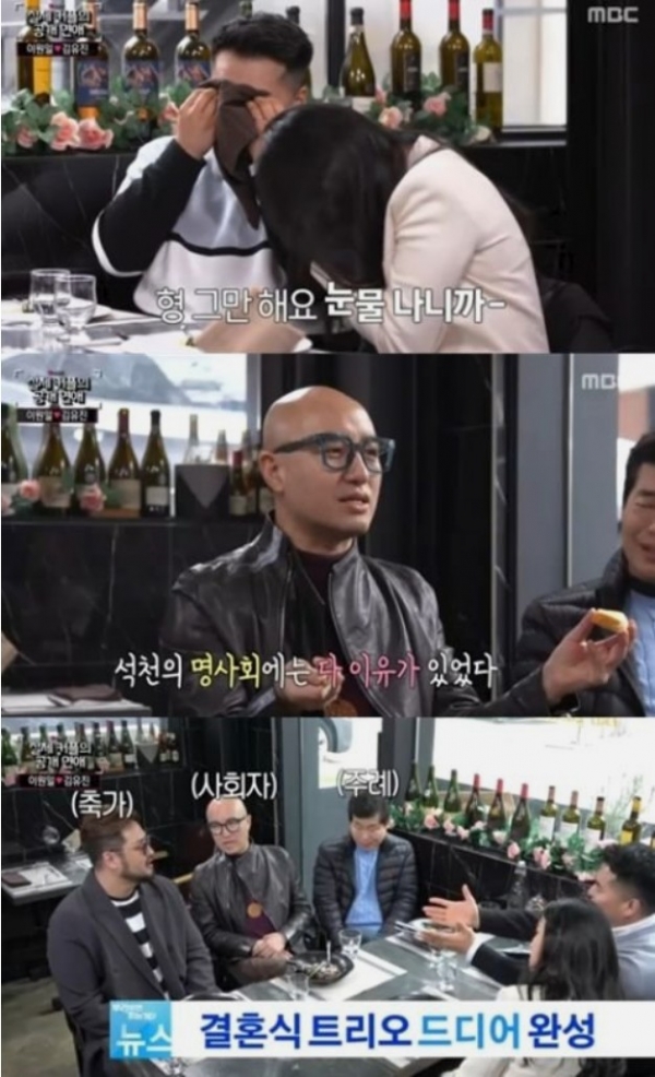프로 사회자인 홍석천은 결국 두 사람의 결혼식 사회를 약속했고, 마지막으로 축가를 맡게 된 김태우가 식사 자리에 합류했다.