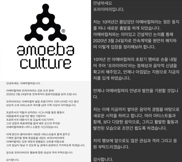 그는 “10여년 간 몸담았던 아메바컬쳐라는 정든 둥지를 떠나 새로운 출발을 하게 됐다”라고 밝혔다. 이어 “아메바컬쳐와는 의미 있고 건설적인 논의를 통해 2020년 3월 24일자로 전속계약을 원만히 해지해 이렇게 입장을 정리해보려 한다”라면서 “10여년 전 아메바컬쳐의 초창기 멤버로 손을 내밀어 주어 ‘프라이머리’라는 정체성과 음악적 신념을 확고히 해줬고 언제나 아낌없는 지원으로 지금의 저를 있게 했다”라고 감사 인사를 전했다.
