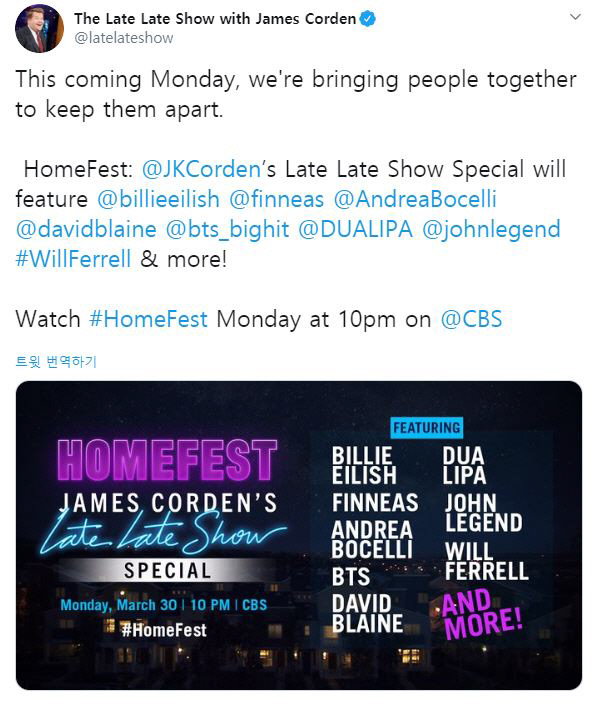 미국 CBS ‘더 레이트 레이트 쇼 위드 제임스 코든(이하 제임스 코든쇼)' 측은 25일(현지시간) "방탄소년단이 3월 30일 방송되는 스페셜 방송인 '홈페스트: 제임스 코든스 레이트 레이트 쇼 스페셜(HOMEFEST: JAMES CORDEN’S LATE LATE SHOW SPECIAL)'에 출연한다"고 밝혔다.