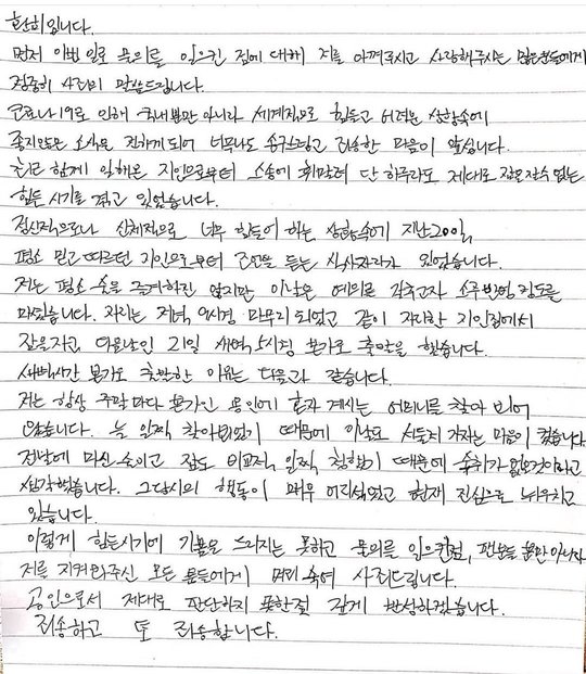 그는 "코로나19로 인해 국내뿐만 아니라 세계적으로 힘들고 어려운 상황 속에 좋지 않은 소식을 전하게 되어 너무나도 송구스럽고 죄송한 마음이 앞선다"며 말문을 열었다.
