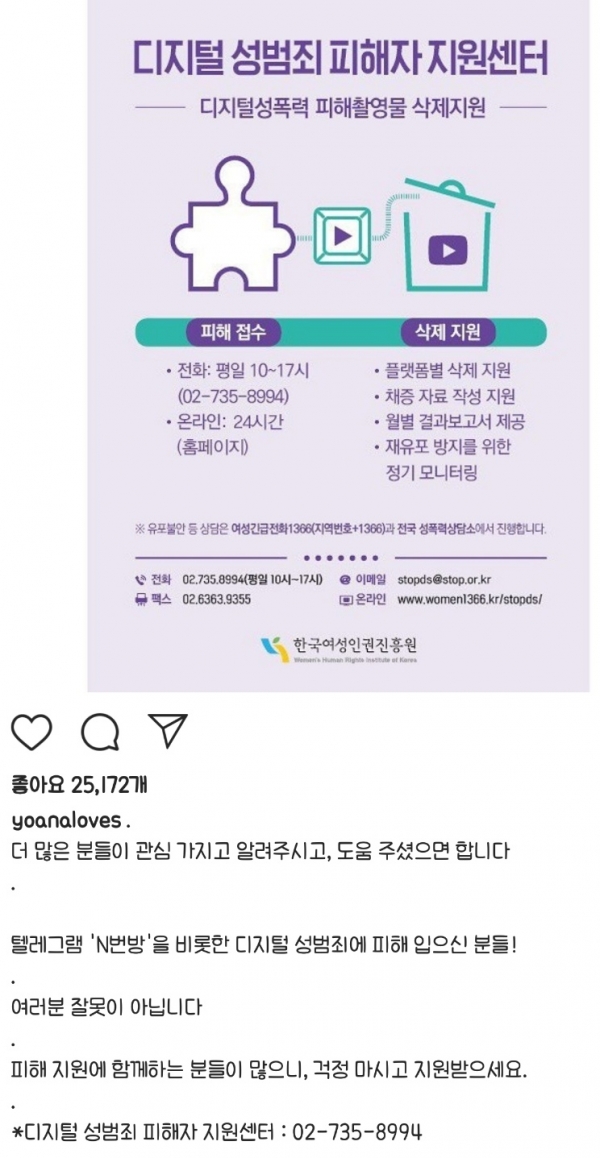 정려원이 올린 포스터는 디지털 성폭력 피해촬영물 삭제지원에 관한 내용이며 도움이 필요한 여성들은 온라인상으로 지원센터 홈페이지를 통해 24시간 피해 접수가 가능하다.