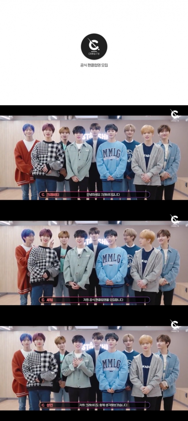 "둘셋! Get closer! 안녕하세요. 크래비티입니다"라는 힘찬 단체인사를 시작으로 멤버 세림은 "좋은 소식이 있습니다. 드디어 저희 공식 팬클럽명을 모집합니다"라고 팬클럽 명 공모 소식을 알렸다. 이어 멤버 원진은 "팬 여러분들의 소중한 의견 많이 부탁드립니다. 기다릴게요"라며 팬클럽명 공모 참여를 독려했다.