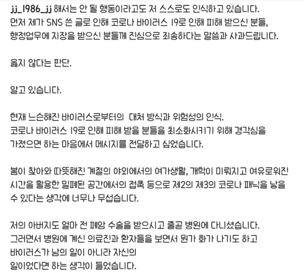 거센 분노에 김재중은 게시물에 “이 글로 인해 받을 모든 처벌 달게 받겠습니다“는 말을 덧붙였다. 그러다 본 게시물을 삭제하고 한 시간 전에 공식 사과문도 게재했다. ”평상시와 다를 바 없는 복장과 마스크를 착용하지 않은 채 여가생활을 즐기고 계시는 분들이 많아 경각심이 필요하다고 생각했다.“고 이유를 말하고 ”코로나 극복을 위해 힘쓰는 많은 분들께 상심을 드린 점 진심으로 사과드립니다.“는 문장을 포함한 장문의 사과문을 작성했다. 그럼에도 김재중의 3년 전 대만 콘서트에서 실신한 장난을 친 일 등 과거 행동들이 다시금 화두가 되며 여전히 비난은 줄어들지 않고 있다.