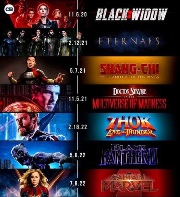 우선 마블(Marvel)은 '블랙위도우'는 11월 6일로 새 개봉일을 확정했고, '이터널스'는 2021년 2월 12일, '샹치'는 5월 7일, '닥터스트레인저2'는 11월 5일 개봉을 준비한다.