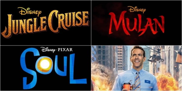 디즈니 자사 스튜디오 개봉 예정작 (시계방향. 뮬란, 프리가이, 소울, 정글 크루즈)
