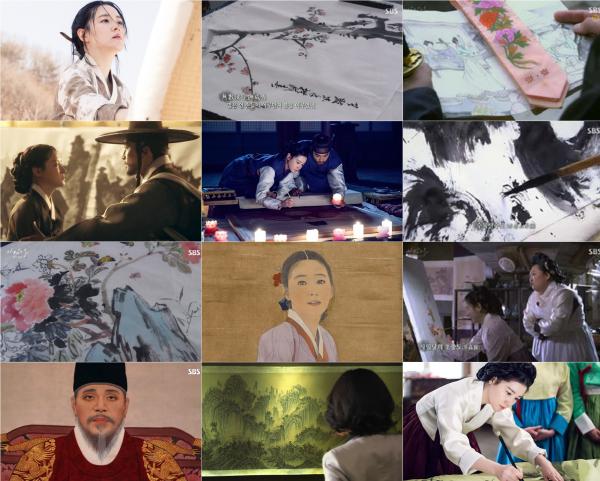 이후 그녀는 ‘수묵산수도’와 ‘초충도’, ‘수박과 쥐’, 그리고 ‘노련도’를 연상케하는 ‘연과 백로’를 차례로 그렸는가 하면, 지난 23회와 24회에서는 극중 이겸과 함께 ‘함박꽃과 나비’, 그리고 ‘중종의 어진’과 ‘금강산도’를 차례로 그리면서 시청자들의 눈을 즐겁게 했다. 여기에다 어린 사임당(박혜수 분)이 그린 것으로 설정된 메뚜기와 나비그림, 양반풍자그림까지 포함하면 무려 스무작품의 이상을 완성시킨 것이다.