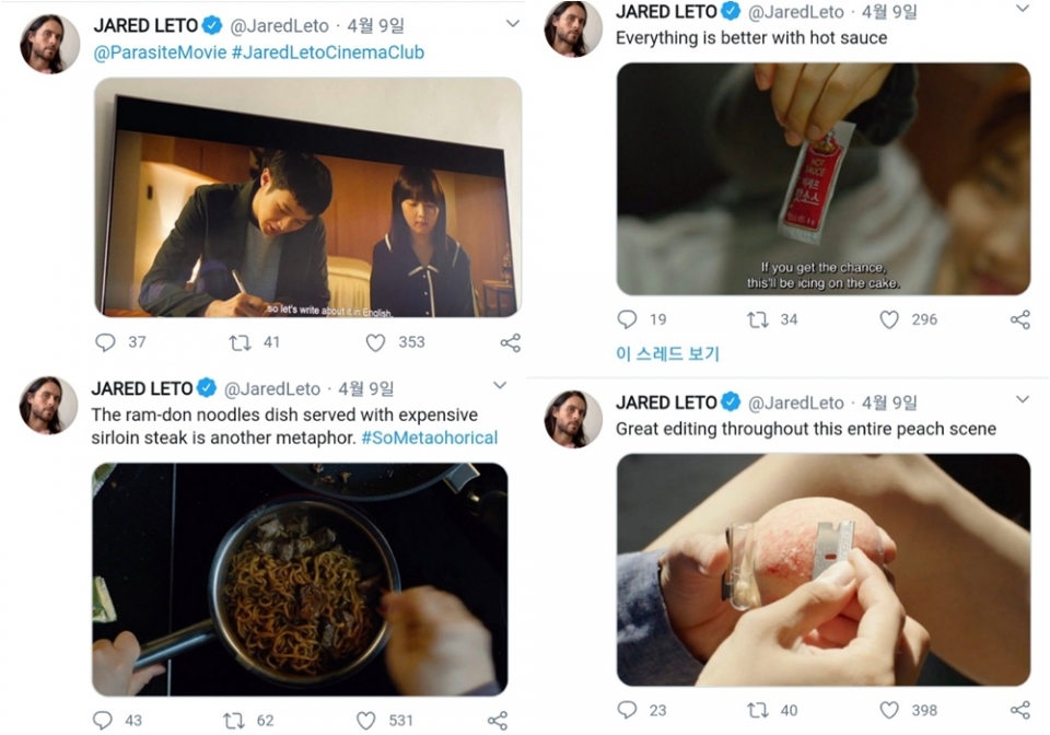 자레드 레토는 이어 '기생충' 시청의 인증샷을 남기기도 했으며, 팬들과 감상평을 공유하기도 했다. 특히, 실제로도 화제가 되었던 '복숭아 신'과 '짜빠구리 신', '제시카송' 등이 나오는 장면을 직접 찍어 사진을 업로드하고 자신의 감상평을 밝히는 등 '기생충'에 푹 빠진 듯한 모습을 보였다.