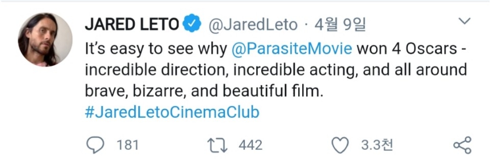 자레드 레토는 9일(한국시간) 오전, 자신의 SNS에 "영화 '기생충'이 왜 오스카 4관왕을 기록할 수 있었는지 쉽게 알 수 있는 영화였다"고 적었다. 이와 함께 "놀라운 연출과 놀라운 연기, 그리고 용감함과 기괴함이 버무러진 아름다운 영화"라고 덧붙였다.