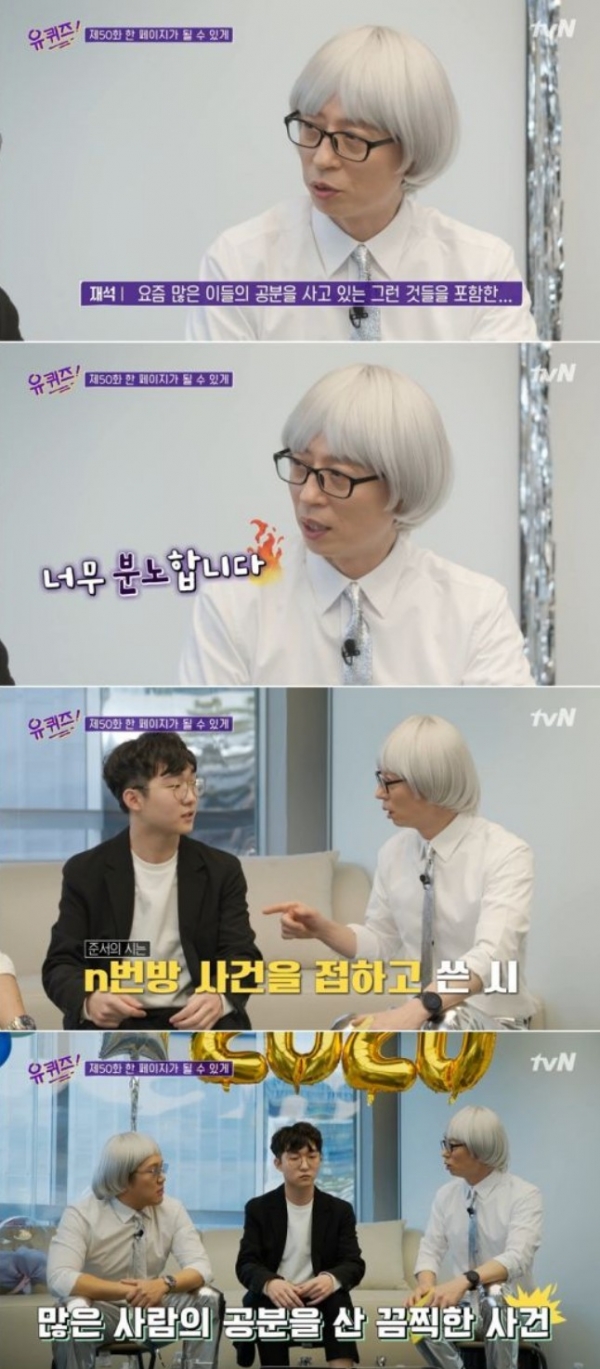 시를 들은 유재석은 "요즘 많은 이들의 공분을 사고 있는 그런 사건(n번방 사건)을 포함한 거 같다. 사실 너무 분노한다. 저하고 조세호도 (처벌) 청원에 동의 눌렀다. 아주 엄청난 처벌을 받았으면 좋겠다"라고 털어놨다.