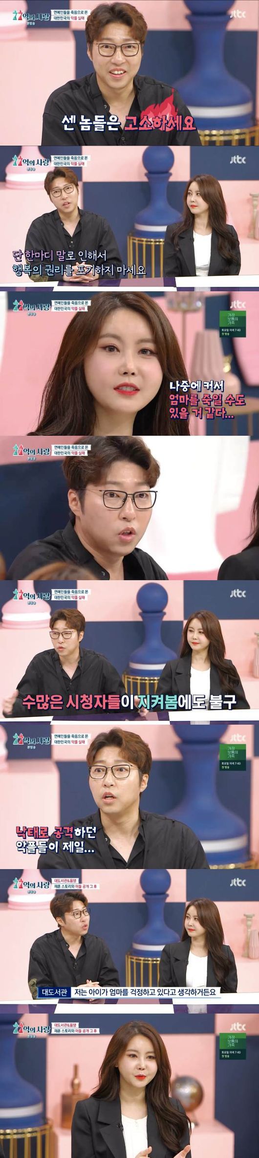 20일 오후 방송된 JTBC 예능프로그램 '77억의 사랑'에서는 대도서관과 윰댕이 출연해 상처가 됐던 악플 내용을 공개했다.