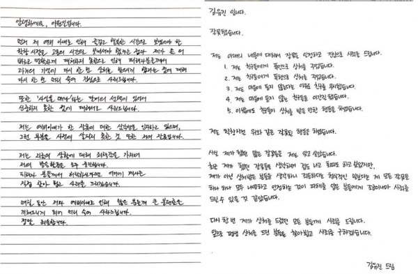 김 PD가 직접 쓴 손편지를 보면 “저는 친구들에게 폭언과 폭행으로 상처를 줬었다”라며 “마음에 들지 않는다는 이유로 친구를 무시했고 이간질했다. 이밖에도 친구들이 상처 받을 만한 행동을 했다”고 과거의 언행을 반성했다.