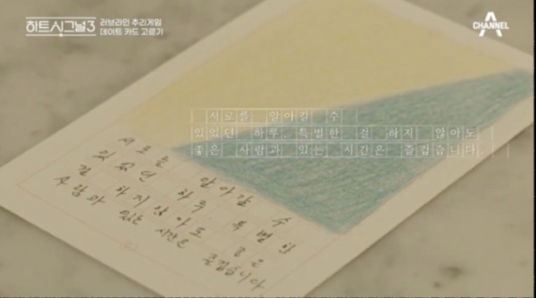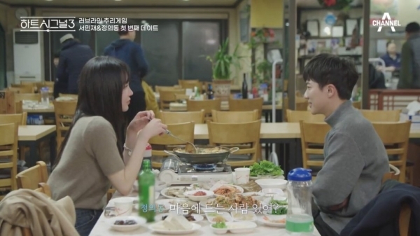 [스타인뉴스 오준열 인턴기자] 지난 22일 방송된 채널A '하트시그널3'에서는 처음으로 본격적인 1:1 데이트가 이뤄졌다. 정의동-서민재, 천인우-이가흔, 박지현-임한결이 짝을 지어 데이트를 했다. 각자 남자들이 그린 엽서를 보고 원하는 엽서를 선택해서 데이트를 했다. 먼저 '정의동'은 '서민재'를 자신이 좋아하는 장소인 강화도로 데려가서 바다와 절을 보고 횟집에서 술도 한잔하면서 진솔한 토크를 이어갔다. 정의동은 특유의 친절함으로 데이트를 이끌었고 "좋은 장소는 4계절 다 와본다."등의 멘트를 날리며 패널들을 감동하게 했다.