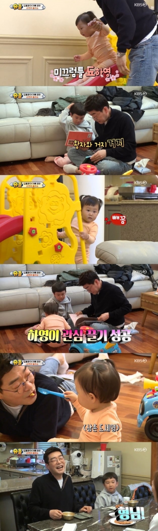장윤정과 도경완은 슈퍼에 가기 위해 손현주에게 연우와 하영을 잠시 맡겼다. 손현주는 잠시 당황한 모습을 보였으나 금세 아이들과 환상의 케미를 보였다. 하영은 손현주가 태워주는 미끄럼틀을 즐거워했고 연우는 손현주가 읽어주는 동화책에 푹 빠져들었다.