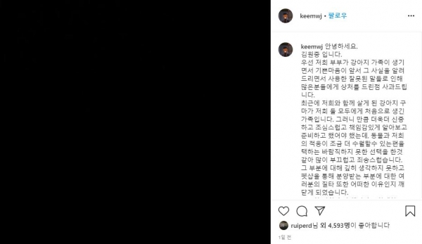 [스타인 뉴스 서관민 인턴기자] 김원중 곽지영 부부가 반려견 입양과 관련하여 논란을 빚어 오늘 김원중은 개인 인스타그램에 "많은 분들에게 상처드린 점 사과드린다는"내용의 사과문을 게시했다.