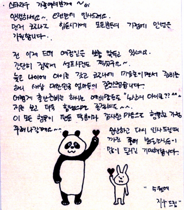 [스타인뉴스 양경모 기자] 출산을 앞둔 배우 최지우(45)가 자필 편지로 근황을 전했다.
