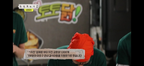 결국 100마리 모두 기부에 성공한 '토토닭'행사는 1000마리에 치킨 쿠폰을 얻었고 이는 결식아동들에게 기부될 예정이다. '놀면 뭐하니?'는 매주 MBC에서 토요일 오후 06시30분에 방송된다.