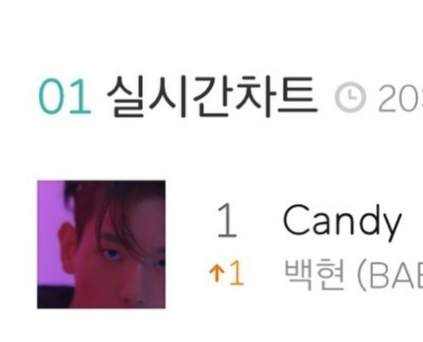공개된 사진에는 백현이 이날 발표한 솔로 미니앨범 2집 'Delight(딜라이트)'의 타이틀곡 '캔디'가 실시간 음원차트 1위에 오른 모습이 담겼다. '캔디'는 백현이 지닌 다양한 매력을 여러가지 맛의 사탕에 비유한 위트 있는 R&B 곡이다. 발매 당일 차트 1위를 달성한 백현은 엑소 팬클럽 엑소엘에게 애칭을 부르며 고마움을 표현했다.
