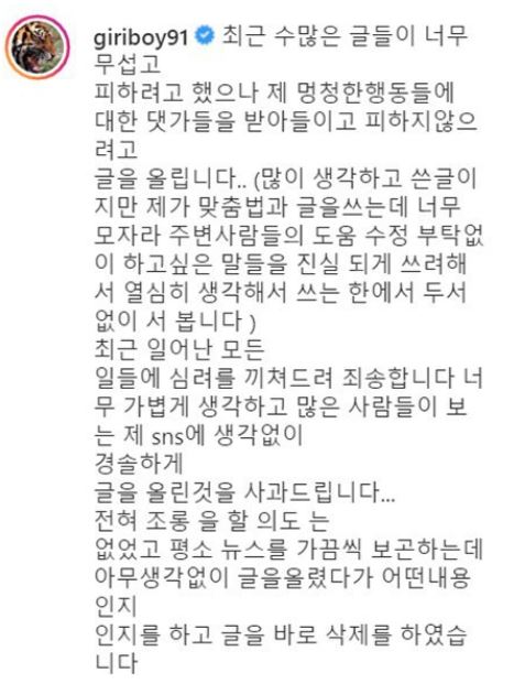 기리보이는 "최근 일어난 모든 일들에 심려를 끼쳐드려 죄송하다. 너무 가볍게 생각하고 많은 사람들이 보는 제 SNS에 생각없이 경솔하게 글을 올린 것을 사과드린다"며 "전혀 조롱을 할 의도는 없었고 평소 뉴스를 가끔씩 보곤 하는데 아무 생각없이 글을 올렸다가 어떤 내용인지 인지를 하고 글을 바로 삭제했다"고 적었다.
