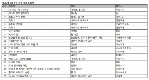예스24 6월 1주 종합 베스트셀러에서는 부와 행운의 비밀에 대한 수만 건의 사례 분석과 성찰을 담은 <더 해빙 The Having>이 8주 연속 1위 자리를 굳건히 지키고 있다. <나는 나로 살기로 했다> 김수현 작가의 4년 만의 신작 <애쓰지 않고 편안하게>는 2위를 유지했으며 팟캐스트 ‘경제의 신과 함께’와 ‘삼프로TV’에 출연한 경제분석가와 전문 투자자 8인이 코로나19 이후의 자산시장을 전망한 <코로나 투자 전쟁>은 한 계단 상승한 3위다. 전 세계가 사랑하는 작가 베르나르 베르베르의 신작 <기억 1>이 일곱 계단 상승해 4위로 나타났으며 대한민국 대표 작사가 김이나가 평범한 단어들 속에 깃들인 특별한 가치를 발견하는 <보통의 언어들>은 두 계단 올라 5위를 차지했다.