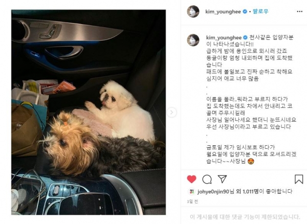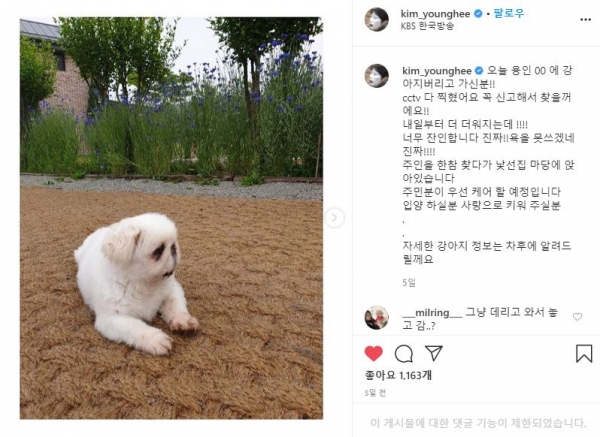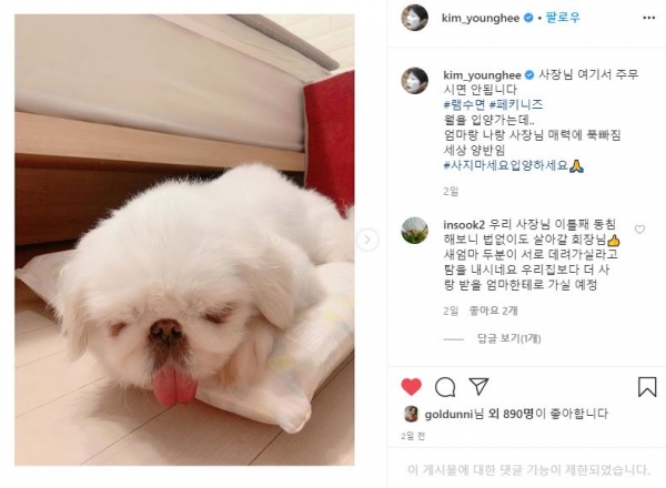 [스타인 뉴스 서관민 인턴기자] 지난 6월 3일 개그우먼 김영희의 인스타그램에 한 사진과 글이 올라왔다. 사진에는 페키니즈로 보이는 하얀색 강아지가 망연자실한 모습으로 앉아있는 모습이었다.