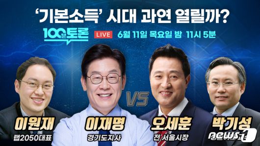 이날 토론에는 이재명 지사와 오세훈 전 시장, 이원재 랩2050대표, 박기성 성신여대 경제학과 교수 등 4인패널이 참여해 ‘기본소득 시대 과연 열릴까’를 놓고 불꽃튀는 토론을 벌인다.