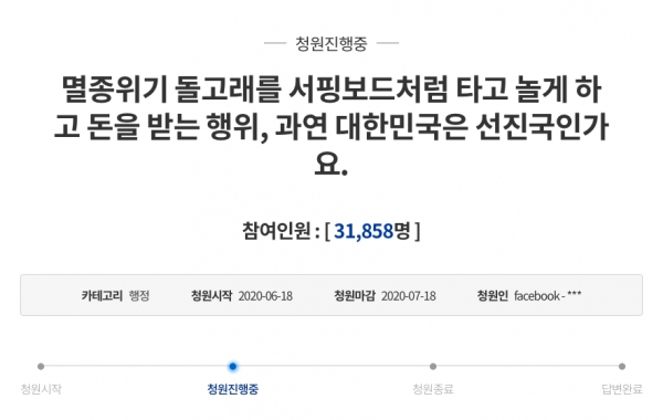이런 사실에 분노한 누리꾼들은 현재 국민청원에는 "멸종위기 돌고래를 서핑보드처럼 타고 놀게 하고 돈을 받는 행위, 과연 대한민국은 선진국인가요."라는 제목으로 청원을 요청하기도 했다.