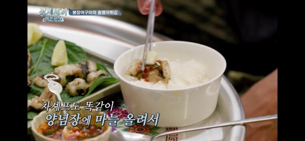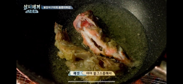 돌문어와 참돔에 이어 붕장어까지 클리어 해버린 참바다 '유해진'이였다. 힘이 너무 좋은 붕장어를 만지는것도 쉬운 일은 아니었다. 차승원은 능숙한 솜씨로 장어구이와 쏨뱅이 튀김을 해 그날 저녁을 마있게 해결했다.