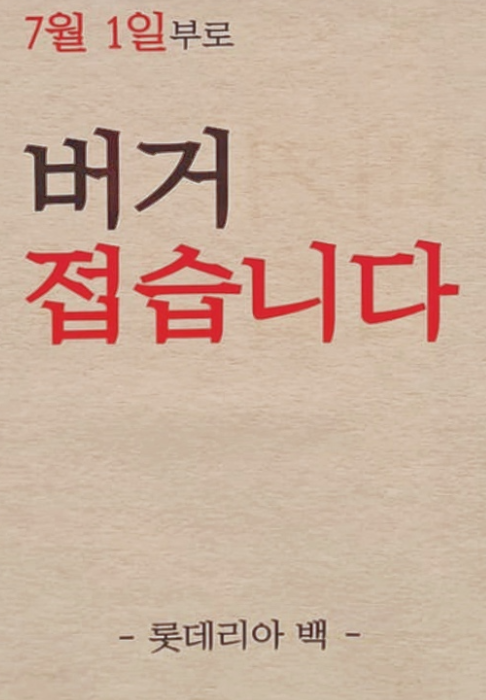 24일 온라인 커뮤니티에는 ‘7월 1일부로 버거 접습니다. 롯데리아 백’이라는 문구가 써진 안내판을 담은 사진들이 올라왔다.