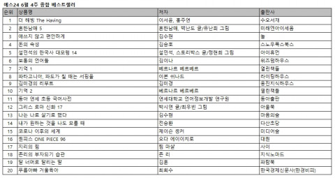 [스타인뉴스 김학철 기자]예스24 6월 4주 종합 베스트셀러에서는 부와 행운의 비밀에 대한 수만 건의 사례 분석과 성찰을 담은 <더 해빙 The Having>이 11주 연속 1위에 등극했다. 인기 유튜브 크리에이터 ‘흔한남매’의 다섯 번째 이야기 <흔한남매 5>는 여섯 계단 상승해 2위에 올랐으며 <나는 나로 살기로 했다> 김수현 작가의 4년 만의 신작 <애쓰지 않고 편안하게>는 한 계단 하락한 3위로 나타났다. 스노우폭스 그룹의 김승호 회장이 전하는 맨손에서 종잣돈을 만들고 돈을 불리는 75가지 방법 <돈의 속성>과 어린이들에게 한국사를 쉽고 재미있게 설명하는 <설민석의 한국사 대모험 14>도 한 계단씩 내려 각각 4위와 5위를 차지했다.