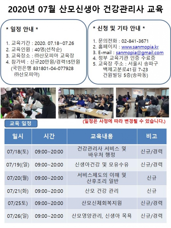 한편 산모피아에서 실시하는 이번 교육의 접수 기간은 7월 15일까지이며 본사로 전화 후 선착순 접수하면 된다.