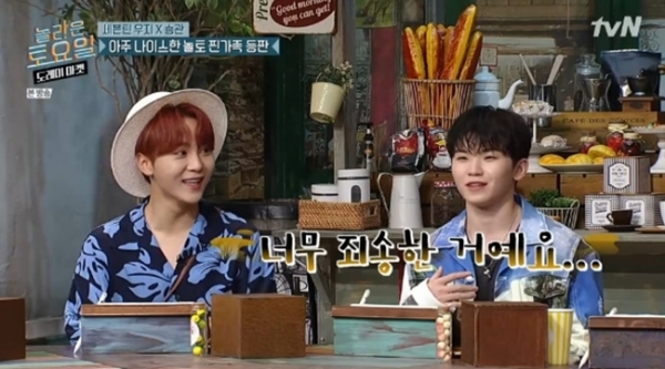 27일 방송된 tvN ‘놀라운 토요일 – 도레미마켓 (이하 ‘놀토’)’에는 세븐틴 승관과 우지가 게스트로 출연했다.