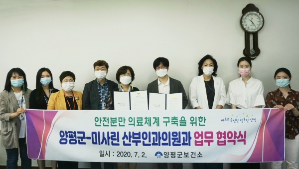 미사린산부인과와 양평군은 상호협력을 통해 의료계의 공동 발전을 추구하고, 양평군 지역사회 임산부들이 안전하게 출산할 수 있도록 다양한 의료서비스와 응급분만시스템을 구축하기로 협의했다.
