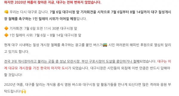 그런데 그렇게 1년이 지난 지금 칠성 개시장은 여전히 활기를 띠고 있다. 올해의 초복인 7월 16일을 기점으로 아마 또 많은 개들이 도살되어질 예정이다. 이에 동물자유연대에서는 오늘 대구 칠성개시장 폐쇄 촉구 기자회견 및 1인 릴레이 시위 안내에 대한 일정을 발표했다.