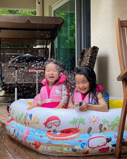 공개된 사진 속에는 소이현 인교진 부부의 두 딸이 마당에서 물놀이를 하고 있는 모습이 담겨 있다.