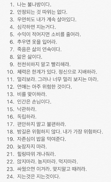 특히 12번 항목인 ‘연애는 아주 위험한 것이다’, 19번 ‘자존심이 밥을 먹여준다’, 23번 ‘싸웠으면 이겨라. 맞지 말고 때려라’ 등이 눈길을 끌었다.
