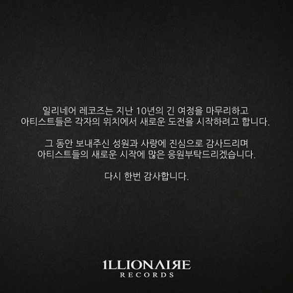 그렇게 잠시 시끌시끌하던 일리네어 레코즈는 어제 이후 결국 공식 인스타그램을 통해 '지난 10년의 긴 여정을 마무리하고 아티스트들은 각자의 위치에서 새로운 도전을 시작하려고 합니다'라며 각자도생을 알렸다.